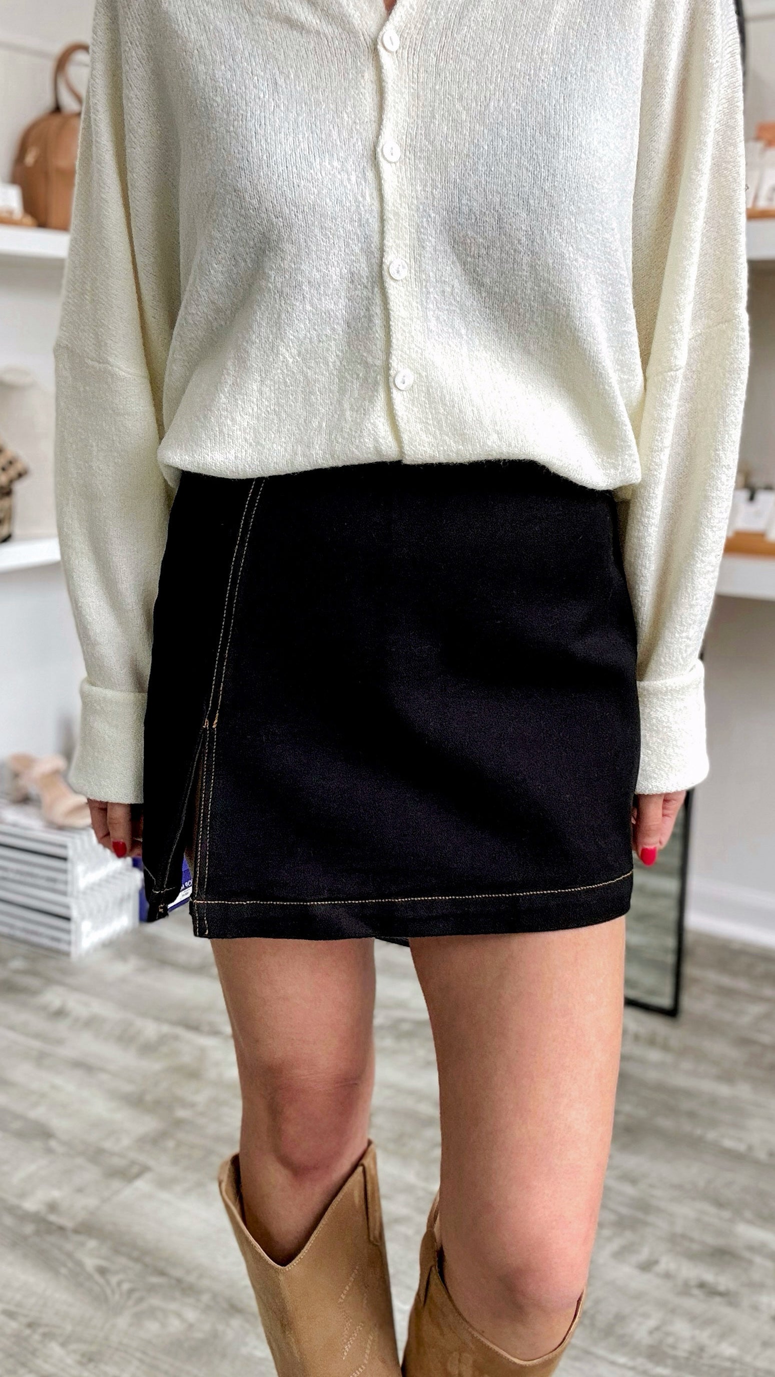High waisted Denim one side single slit slim fit mini skort with a back zipper closure. Looks like a skirt all the way around with shorts lined underneath