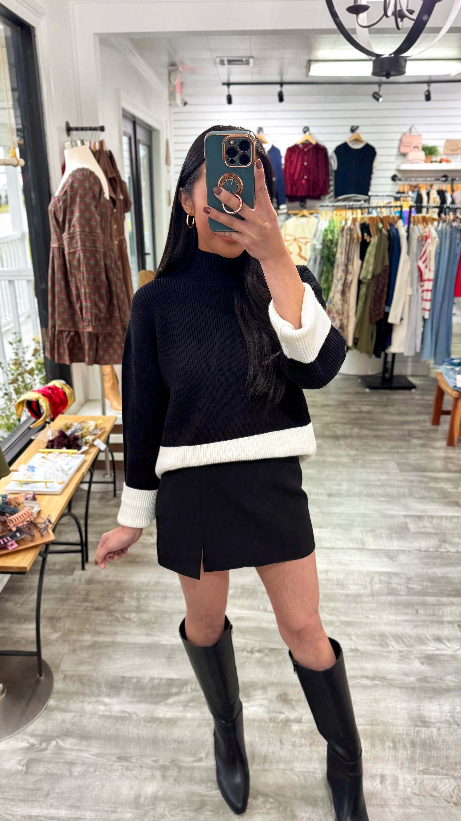 Black/ivory high collar ribbed sweater featuring a relaxed fit