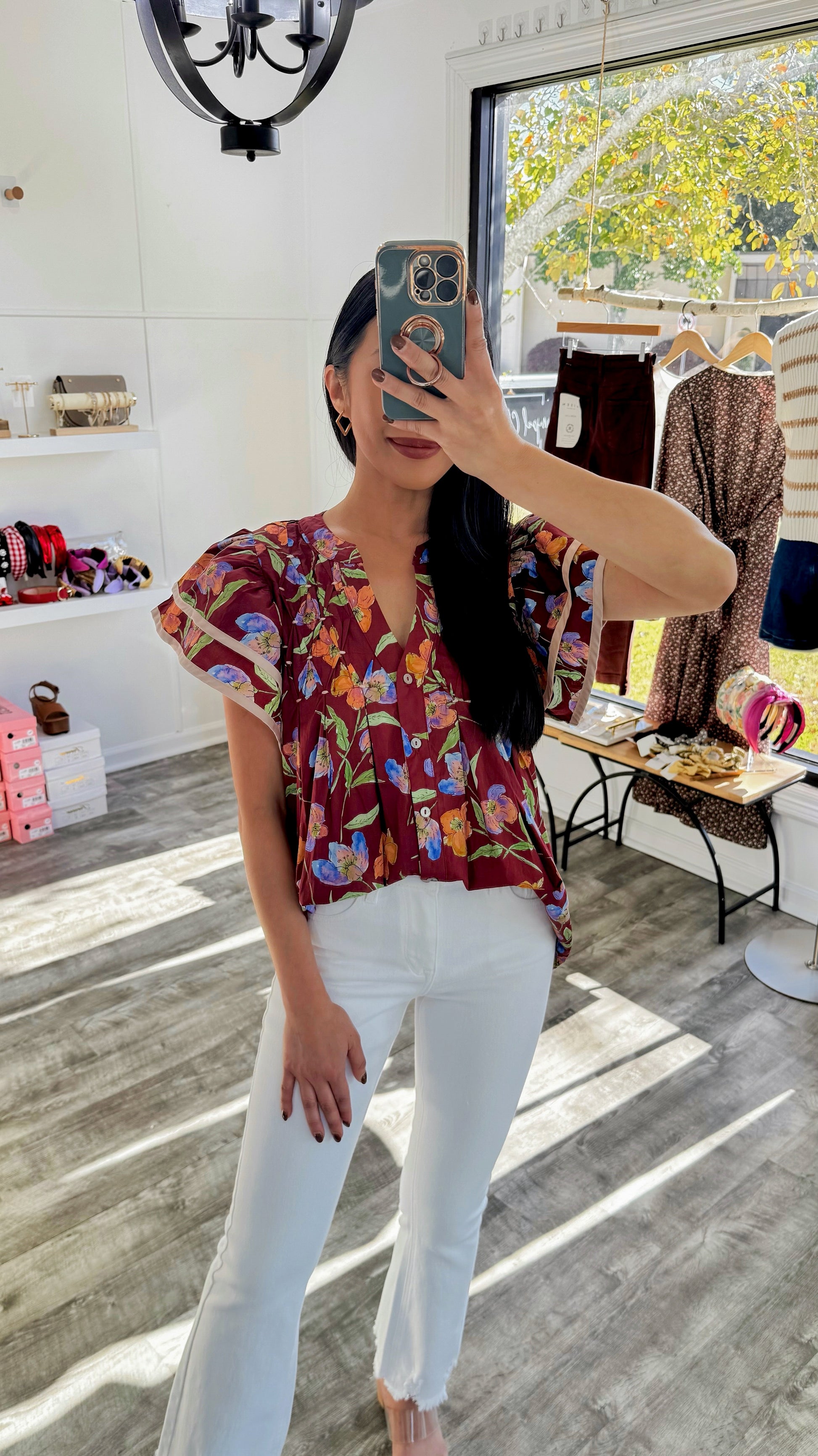Floral pleated short flutter sleeve top featuring contrast binding layered sleeve. Button closure at front. Unlined. Woven. Non-sheer. Lightweight.