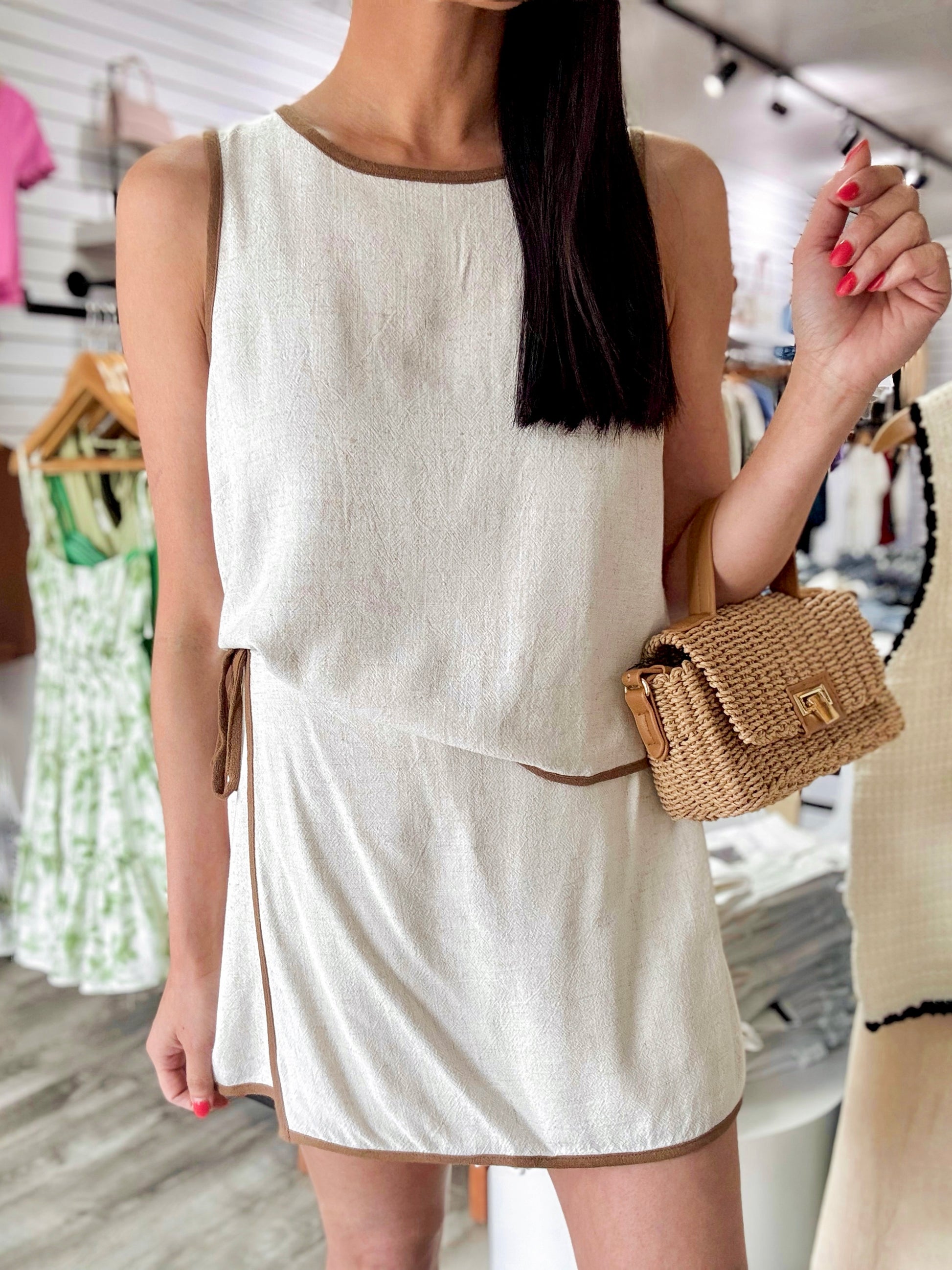 This Contrast trim linen set includes a linen wrap skort with a self side tie and sleeveless linen top