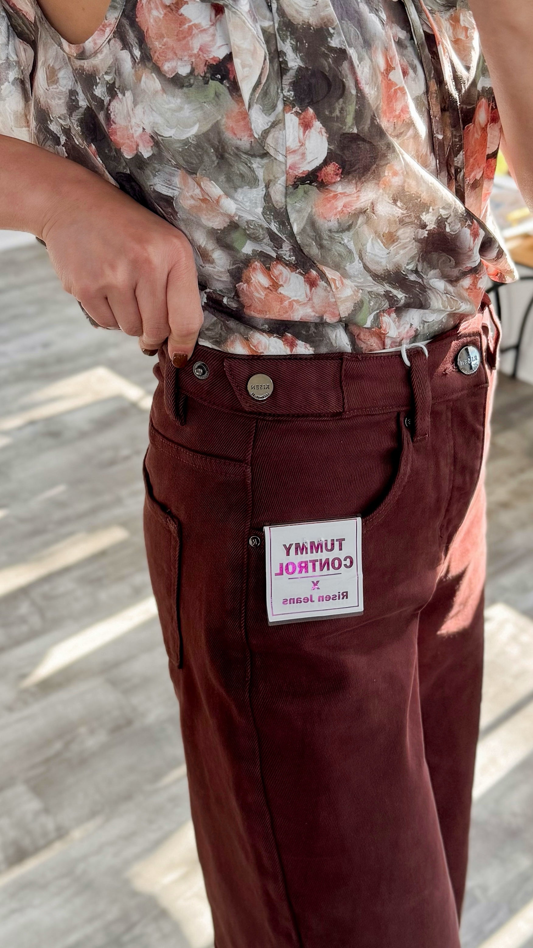 Tummy Control high rise crop wide leg denim featuring a snap button adjustable waist band