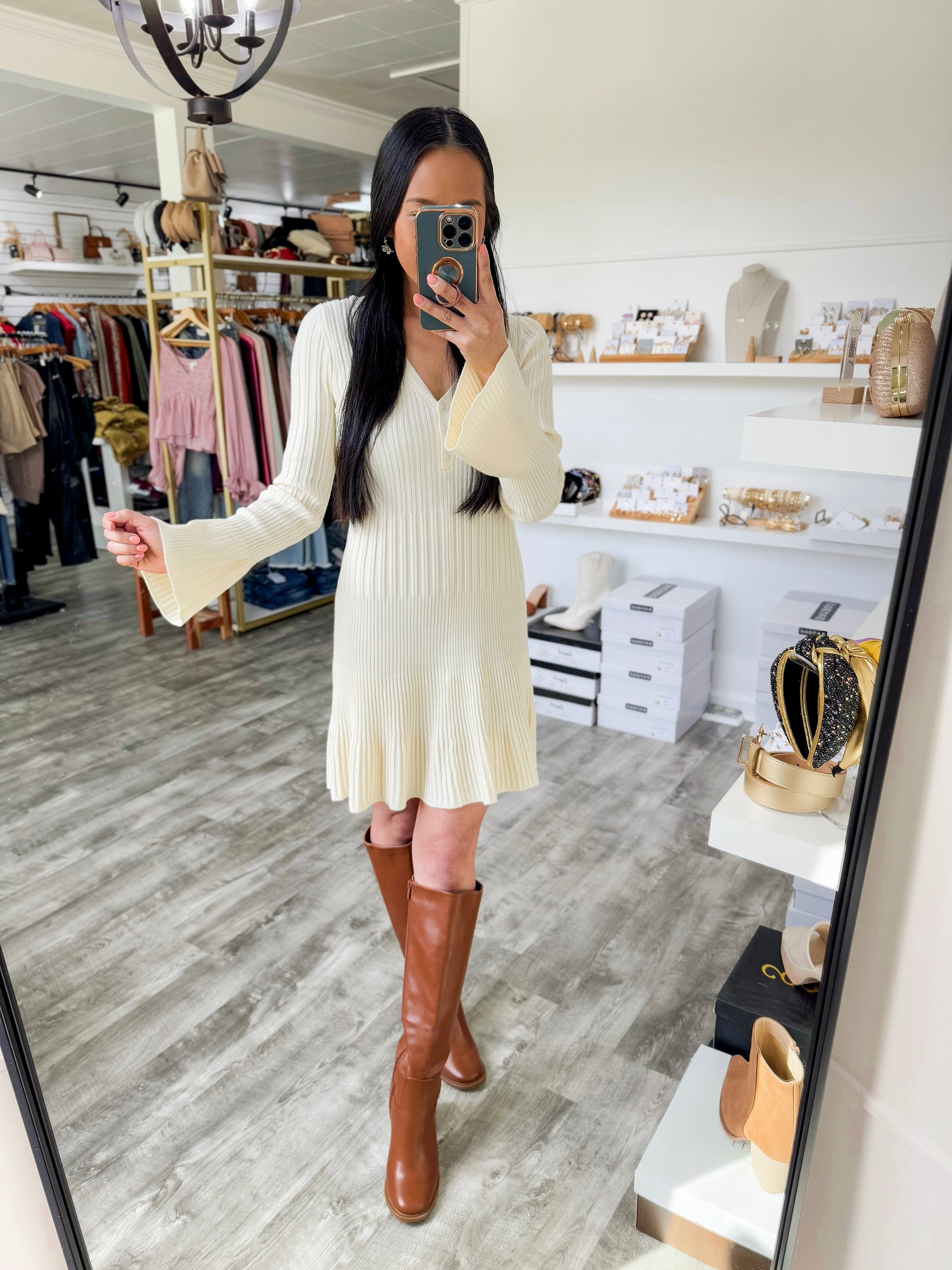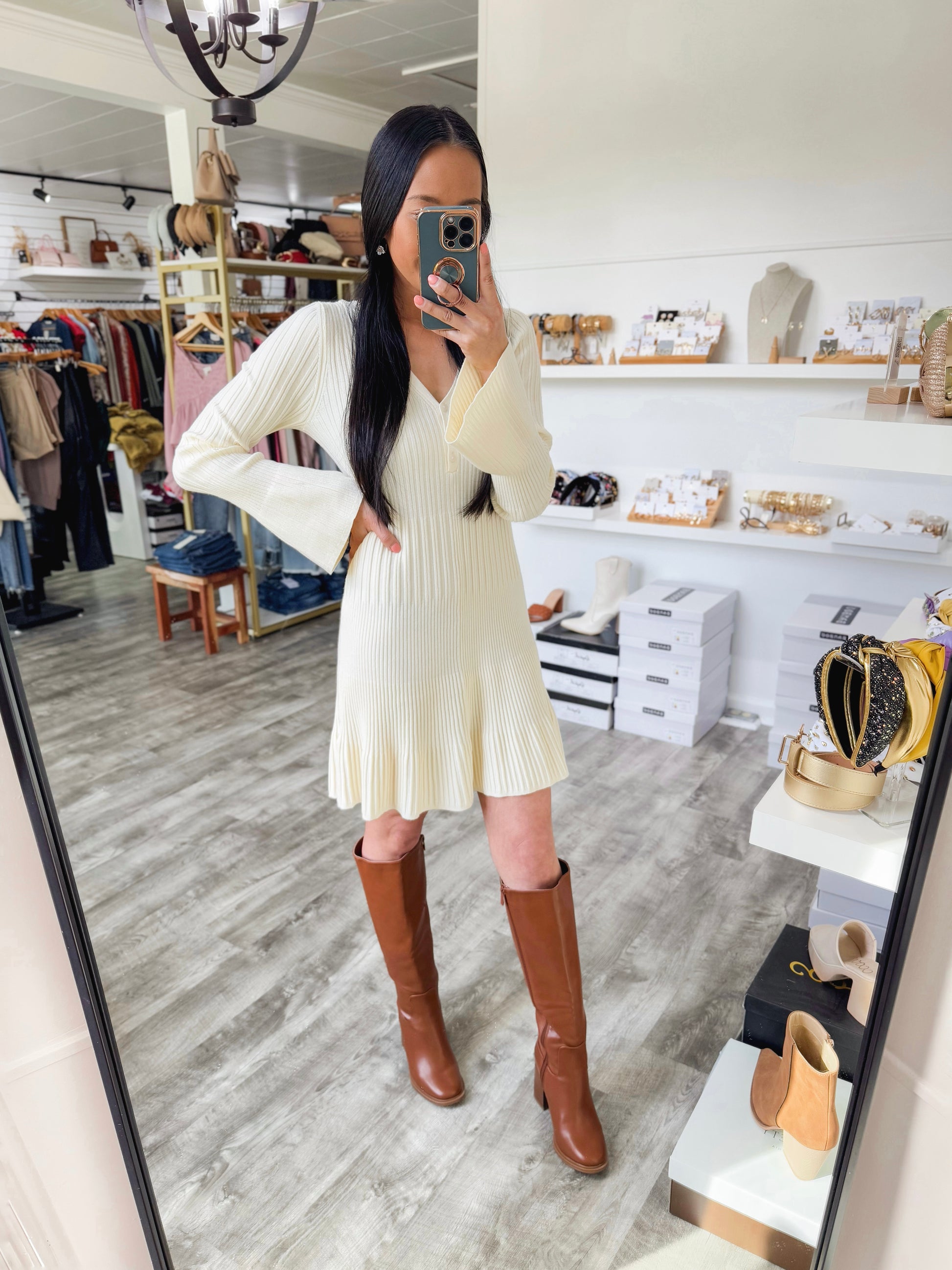V neck long sleeve knit sweater dress featuring mini flare sleeves and a peplum skirt bottom