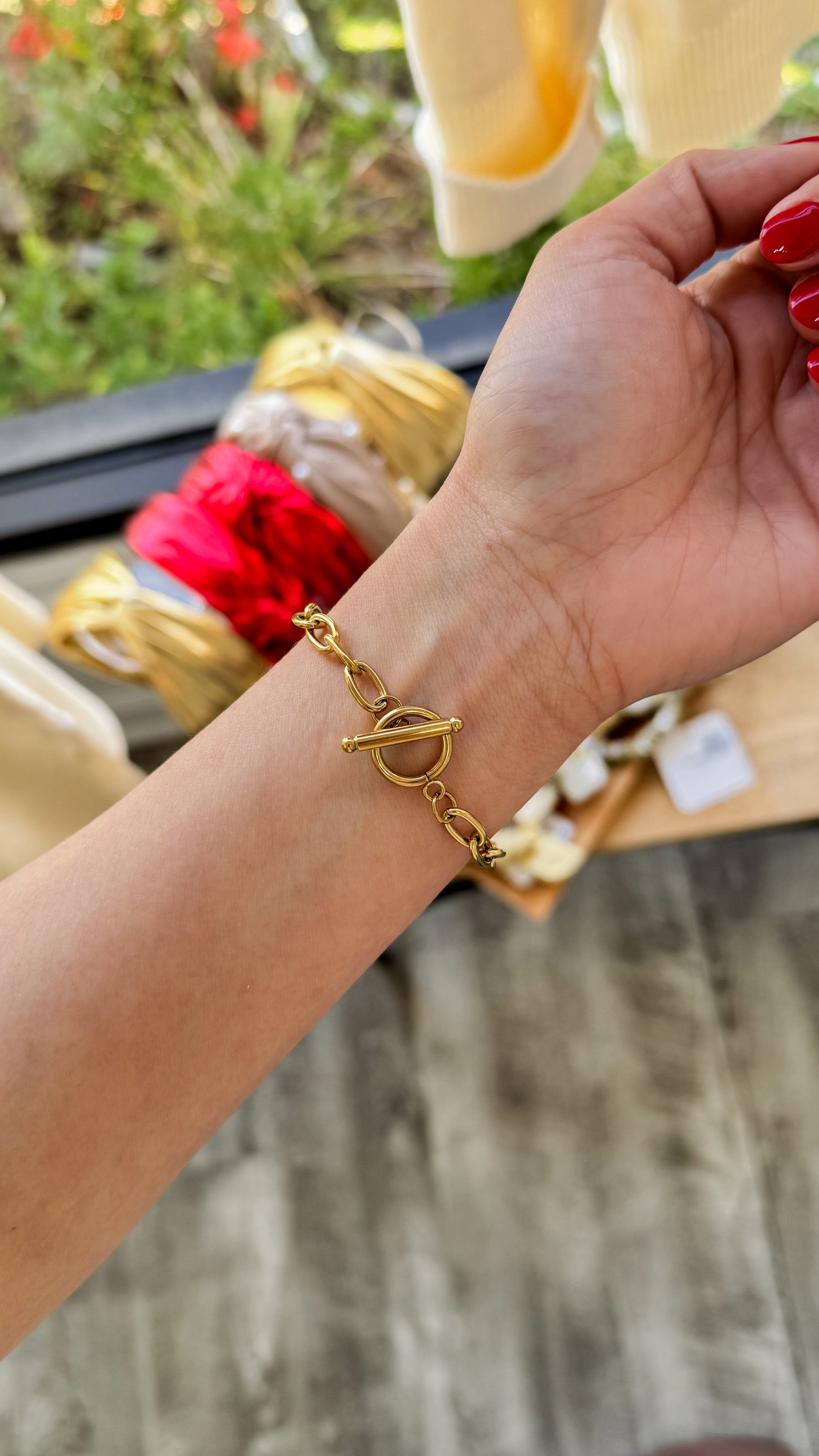 18K gold plated stainless toggle chain bracelet. the bracelet is hypoallergenic, waterproof, fade resistant, and tarnish free.