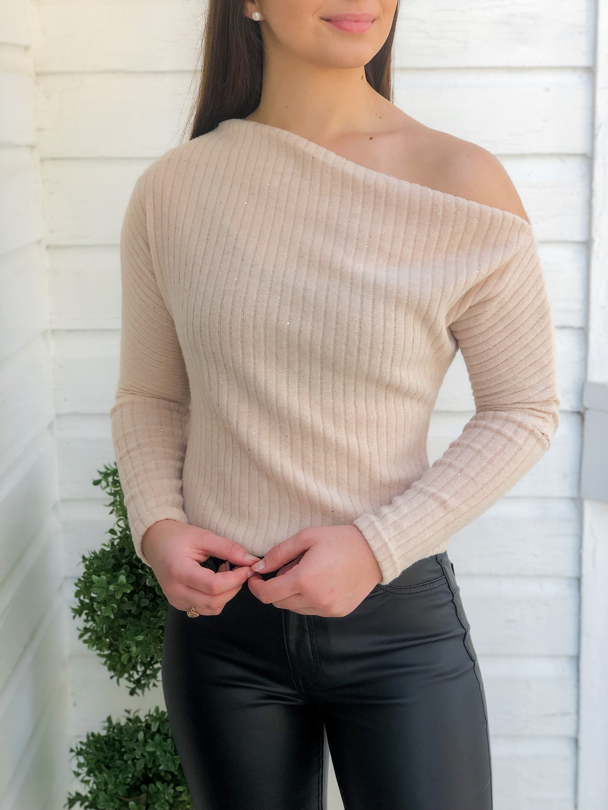 One shoulder knit top with long sleeves featuring subtle sparkle fabrication throughout the top