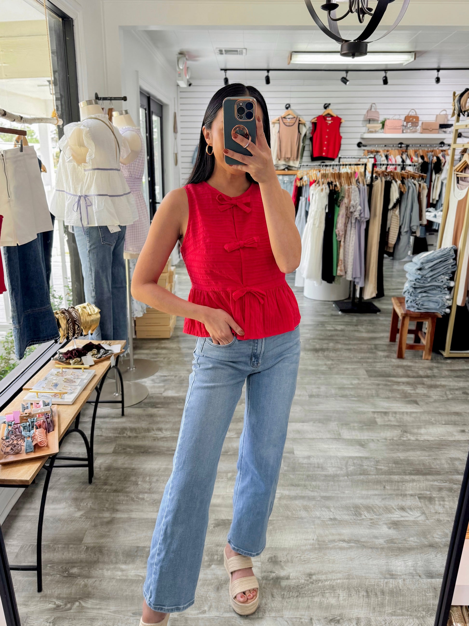 Sleeveless textured self tie triple bow front top featuring a peplum hem bottom